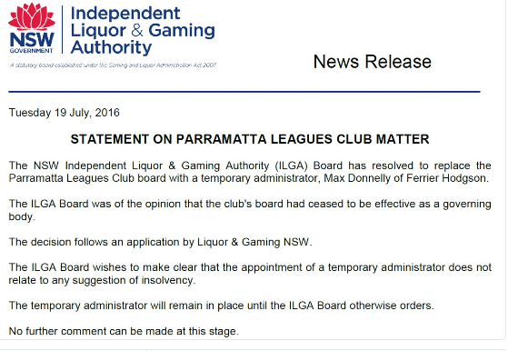 The NSW Government has sacked the Parramatta Leagues Club board and installed a temporary administrator after a Tuesday's meeting decided they "ceased to be effective as a governing body".